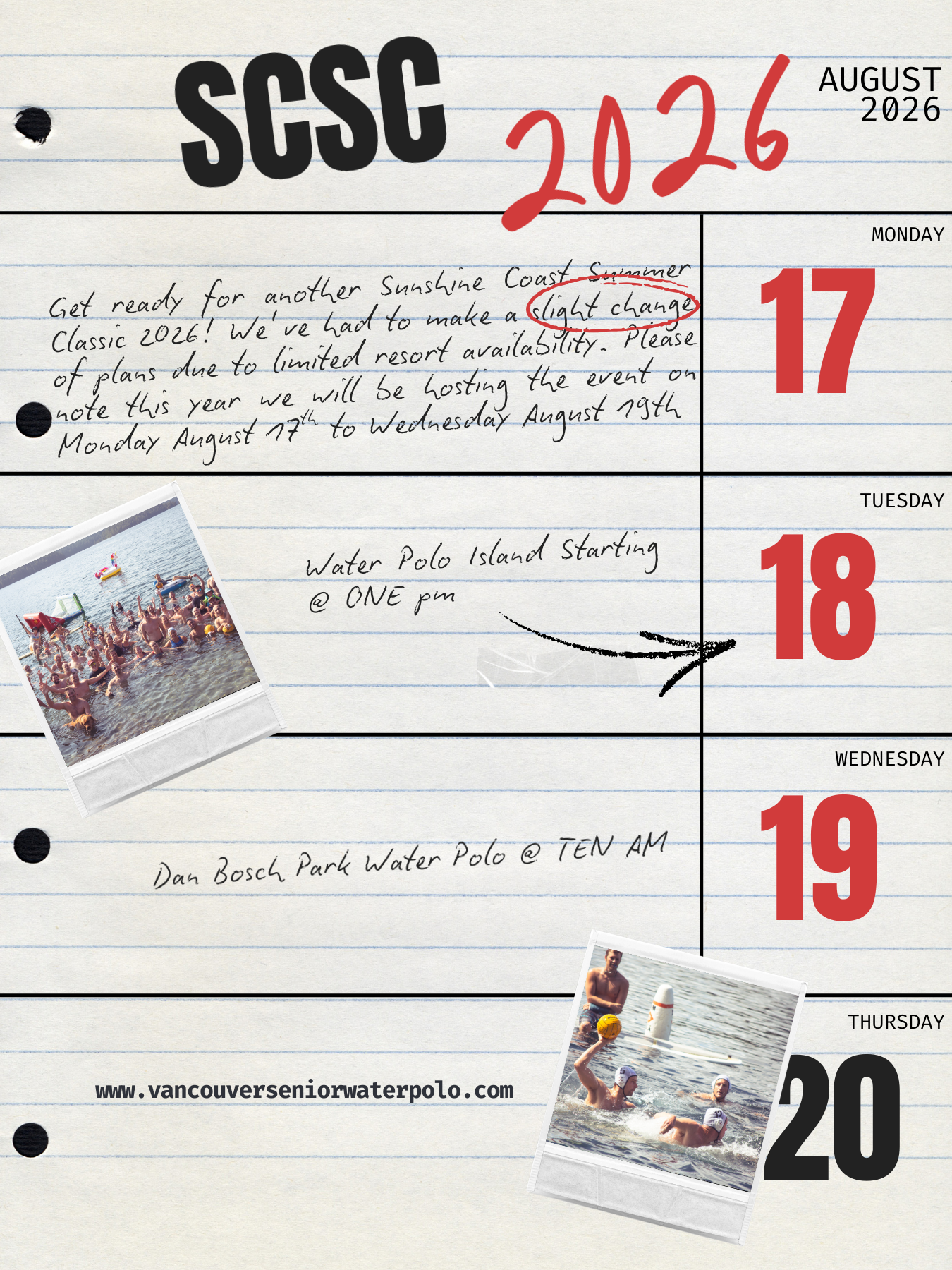 1:00pm on Tuesday (Aug 18) water polo at the 2 islets; easy 600m swim from dock or boats/boards to get people there